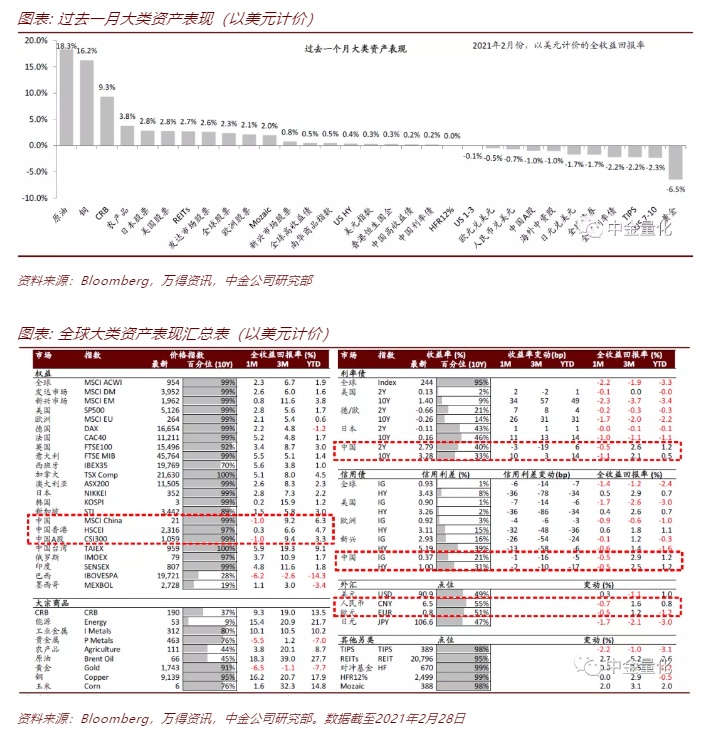 2021年2月,全球商品市场延续1月份以来的强势表现,原油、铜、CRB商品指数、农产品等涨幅靠前;全球权益市场在2月前期表现较好,在2月后期受到美债利率上行的影响出现较大回撤,整体取得正收益,发达市场股票表现优于新兴市场股票;全球债券市场同样经受了美债利率上行的压制,在整个2月份震荡走低,整体取得负收益,高收益债表现优于利率债。