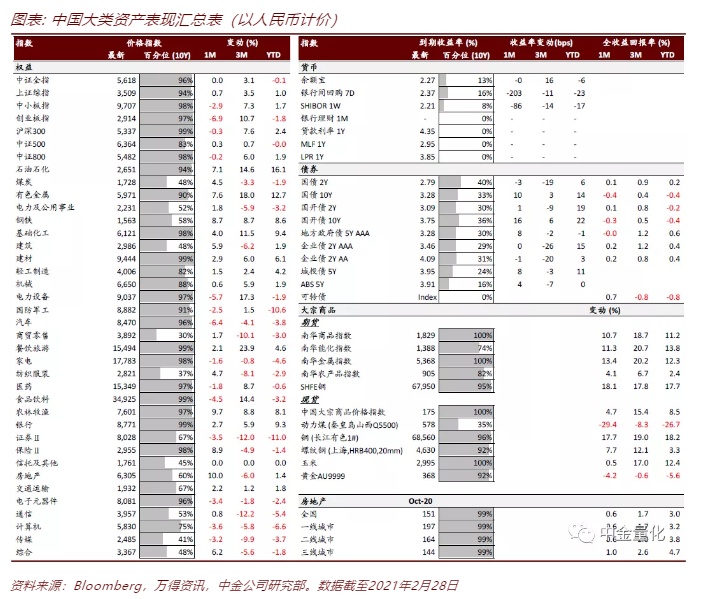 股市方面,2021年2月,中国三大宽基指数基本呈现先扬后抑的走势,春节前的“红包行情”使A股市场表现出较强的赚钱效应;而在春节后,A股市场风格明显切换,基金重仓股出现快速下杀,2020年以来表现不佳的小盘风格和价值风格表现强势;2月最后几个交易日,受美债利率上行的影响,A股市场整体低迷,跌幅较大,最终全月上证综指、深证成指、创业板指的涨跌幅分别为0.75%、-2.12%、-6.86%。
