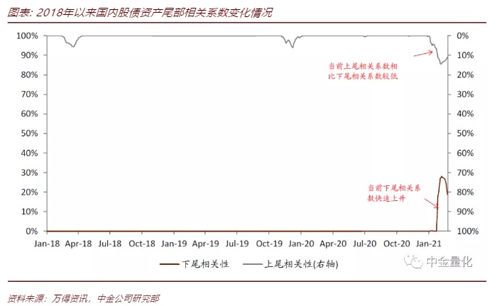 我们在2021年2月5日发布的报告《量化配置系列(3):巧识尾部相关性,规避组合系统性风险》中,借助资产之间的上下尾相关系数,构建了国内股债双杀的预警指标。具体来说,当满足以下三个条件时,触发股债双杀预警指标: