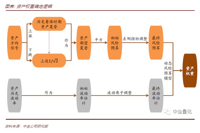 根据我们在2020年12月25日发布的深度报告《外生环境、内生结构、趋势动量在收益预测中的有效结合》,我们将不同预测维度的信号进行融合得到统一化的方向信号,并将方向信号转化为对资产期望夏普的估计,应用于风险预算模型中得到配置权重。