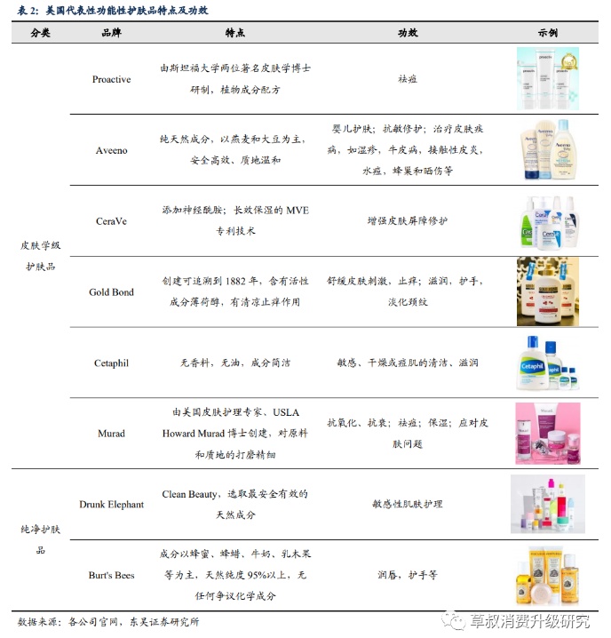 他山之石:美、日、欧的功能性护肤品发展经验几何?受资源禀赋、消费习惯、消费结构等因素影响,各国功能性护肤品演化出不同类型,例如美国青睐高科技成分的皮肤学级产品和纯净护肤品,欧洲尤为流行较为温和的温泉系皮肤学级护肤品,日本流行补水和敏感肌修复功效的皮肤学级产品和纯净护肤品。
