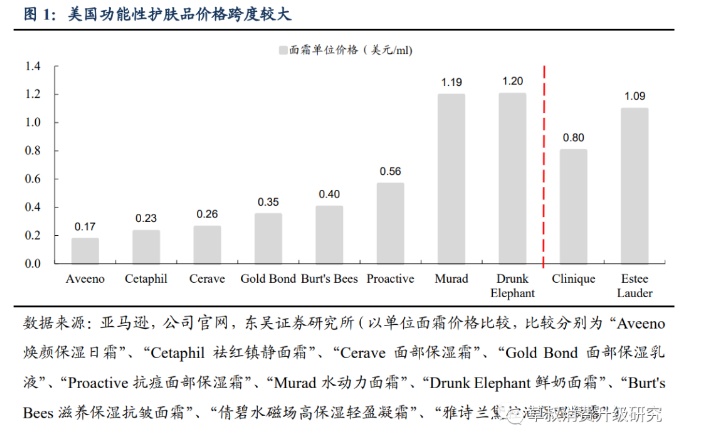 美国功能性护肤品内部不同品牌价格差异较大。美国功能性护肤品品牌覆盖较广。我们以各品牌面霜品类的单位价格为例进行比较,Aveeno、Cetaphil等定价相对亲民,占据大众市场;Murad、Drunk Elephant则定价相对较高,甚至高于雅诗兰黛(EL.US)部分产品单位价格,吸引收入水平较高的消费群体,消费者可依据自己的护肤需求和价格承受能力,选择合适的功能性护肤品。