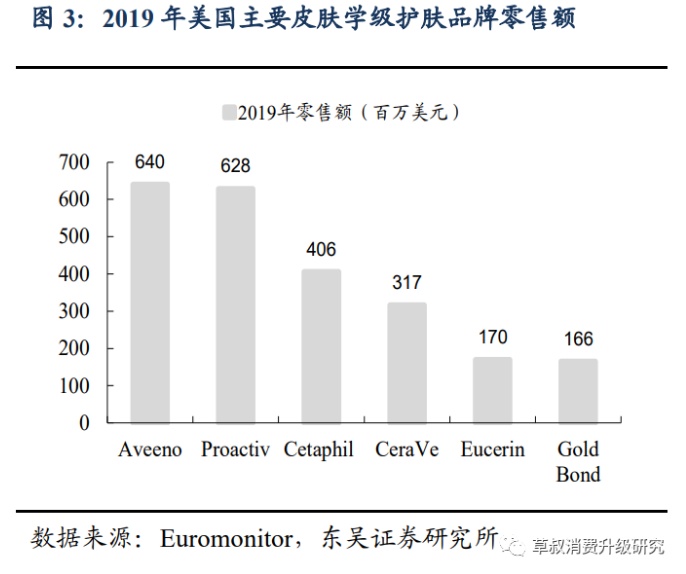 美国主要皮肤学级产品份额较为集中,领先品牌零售额在6亿美元以上,在护肤品中皮肤学级护肤品市占率稳步提升、纯净护肤份额亦快速增加。根据Euromonitor数据,美国皮肤学级产品份额较为集中,2019年前十大集中度达84.8%,其中排名前两位的Aveeno和Proactive零售额均在6亿美元以上。在护肤品各细分领域中,Cetaphil、CeraVe、Gold Bond等主要皮肤学级护肤品品牌份额稳步提升,纯净护肤品例如Drunk Elephant和Burt’s Bees份额亦快速增加。在2019年美国护肤品前十位中,共有3个功能性护肤品,其中有2个皮肤学级护肤品,1个纯净护肤品(Burt’s Bees)。
