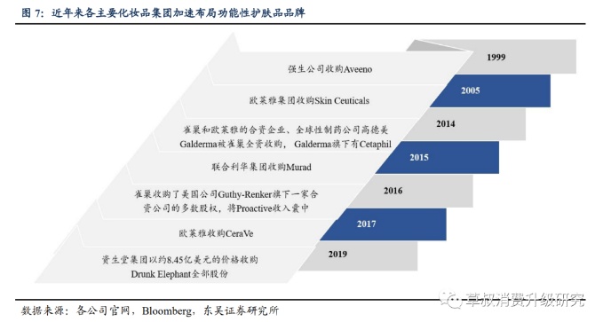 近年来主要化妆品集团纷纷收购或入股功能性护肤品品牌,以对产品线形成有效补充。功能性护肤品近年来发展势头良好,而传统化妆品集团以往品牌矩阵中对该细分领域覆盖并不多,主要通过收购或入股方式加码核心功能性护肤品品牌,例如强生集团(JNJ.US)在1999年收购Aveeno,欧莱雅集团分别于2005和2017年收购Skin Ceuticals和CeraVe,资生堂集团2019年以8.45亿美元收购Drunk Elephant。