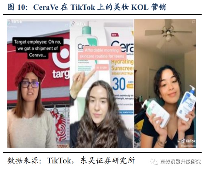 美国功能性护肤品营销方式趋于多样化,社交媒体成为营销新阵地。较早成立的功能性护肤品品牌大多采取相对传统的电视广告、代言人、线下硬广等方式,例如艾惟诺花费千万美金聘请“美国甜心”珍妮弗·安妮斯顿作为品牌代言人,肌肤哲理十年来先后与四位公众人物合作推广,ChapStick和Procactive把电视广告视作重要营销方式之一。同时,随着社交媒体兴起,全面社交媒体化下的内容营销或将成为主流。例如,适乐肤近年来将数字营销预算扩大了十倍,与TikTok上500万粉丝量级的美妆KOL的合作反响较好。Drunk Elephant的快速崛起,除了独特的产品理念以及吸引眼球的包装,还离不开KOL、美妆博主们在Instagram、Youtube等社交平台上对其产品的评测和赞誉。