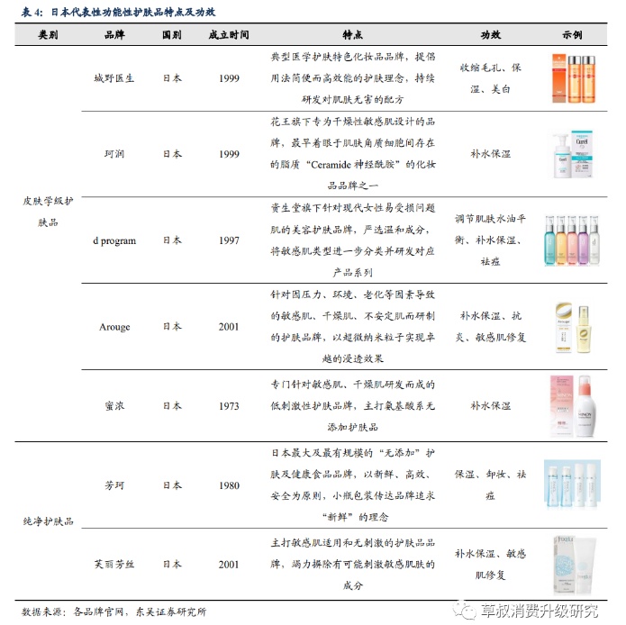 日本功能性护肤品包括皮肤学级护肤品和纯净护肤品,总体较为温和,功效主要为补水保湿和敏感肌修护。日本国内皮肤学级护肤品和纯净护肤品均发展较为顺利,皮肤学级护肤品牌包括城野医生、珂润、d program等,其中不少为专门针对敏感肌人群的品牌,从功效上看由于日本消费者更追求水光感肌肤,所以注重补水保湿且更为温和。纯净护肤品包括芳珂和芙丽芳丝等,例如芳珂是日本最大及最有规模的“无添加”护肤品牌,不含日本政府列出的102种对皮肤构成敏感的防腐剂及有损肌肤的添加剂,为保证产品品质不大量生产及大量储货。