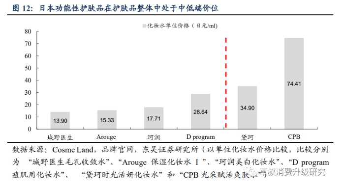 日本功能性护肤品价格主要为中低价位。以各品牌化妆水品类的单位价格为例进行比较,功能性护肤品城野医生、珂润、每毫升价格均低于中高档品牌黛珂、CPB和SK-Ⅱ,总体价位适合大众消费者。