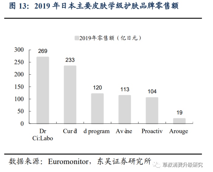 日本主要皮肤学级护肤品前三位均为本土品牌,纯净护肤品牌市占率稳步增加。根据Euromonitor数据,日本皮肤学级产品前三位分别为城野医生、珂润和d program,2019年地区零售额分别为269/233/120亿日元,在皮肤学级产品中份额占比总共超60%。主要皮肤学级护肤产品在护肤品整体市占率趋势较为平稳。纯净护肤品芳珂近年来在护肤品类市占率稳步提升。