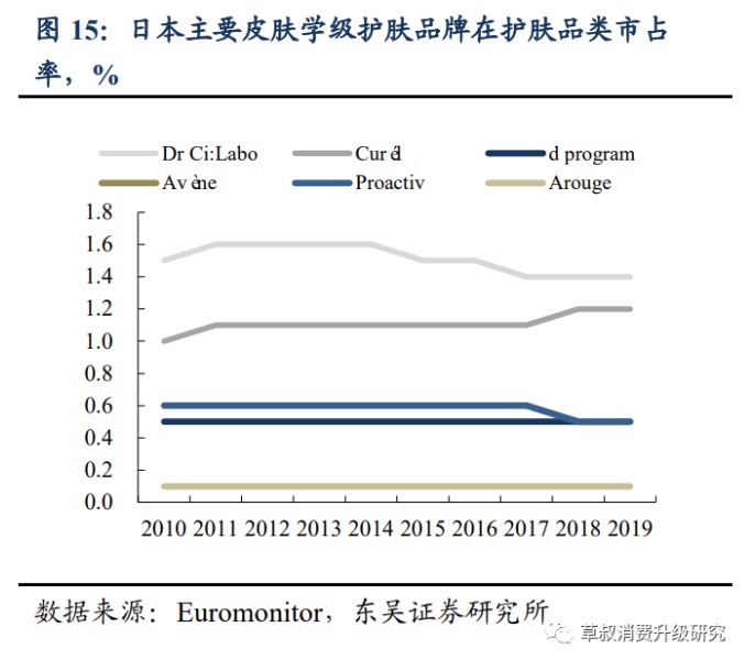 西欧主要皮肤学级产品前三位均为温泉系且零售额均在6亿元以上,皮肤学级护肤品牌在护肤品市占率稳中略升。根据Euromonitor数据,西欧皮肤学级产品前三位分别为雅漾、理肤泉和薇姿,均为温泉系代表品牌,2019年在西欧地区零售额分别为7.5/6.8/6.1亿元。在皮肤学产品前十名中,从品类上看,共有3个温泉系品牌、4个植物系品牌和3个科学系品牌;从国别上看,共有7个法国品牌,3个德国品牌,法国和德国在功能性产品发展上领先于西欧其他地区。另外,2010-2019年皮肤学级护肤品牌在护肤品整体市占率总体稳中略升,其中理肤泉、贝德玛、欧缇丽提升相对较快。