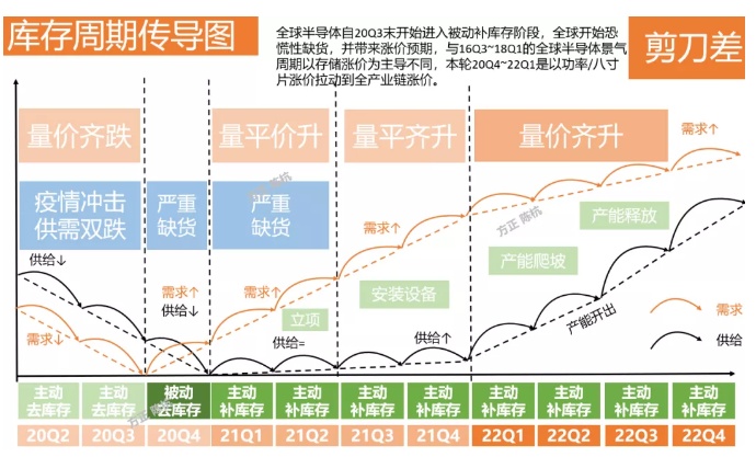 自20年二季度开始,半导体行业出现明显的供需剪刀差。剪刀差分为三个阶段,我们聚焦于最近一年和未来三年的情况(如图表1):