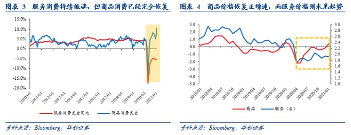 服务价格难以“恢复”至正常增速,就制约着核心PCE同比的上行斜率。去除能源的服务价格在PCE中的占比约58%(食品服务占比极小,可忽略),而去除食品和能源的核心PCE在PCE中的占比约为84%,所以去掉能源的服务价格在核心PCE中的占比接近70%。这就意味着,如果消费场景无法恢复(收入不是影响服务消费的主要因素,财政刺激后美国居民“有钱”),服务价格同比增速无法恢复至正常水平,那么核心PCE的上行斜率就必然会受到限制。