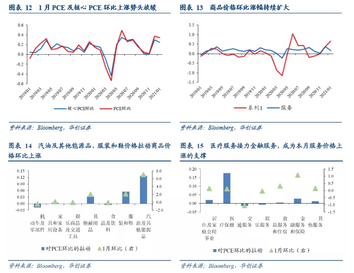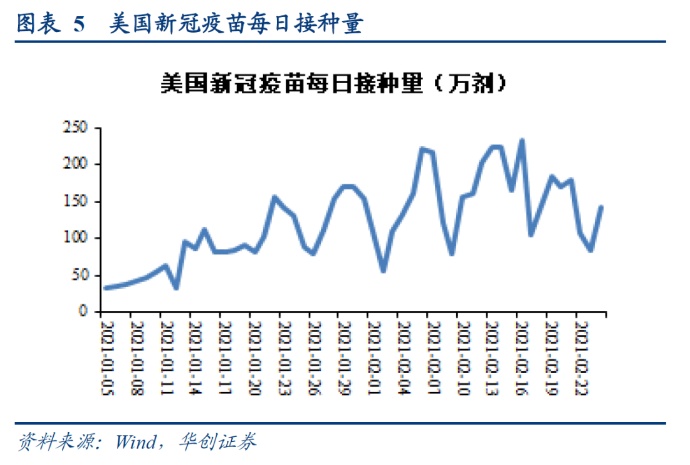 2月初美国疫苗日度接种数量就已突破200万剂,因最近严寒天气使疫苗交付推迟并迫使部分疫苗接种点关闭,所以日度接种量短期内略有回落。随着后期疫苗接种进度有序推进,美国服务消费场景有望逐渐全方位放开,随之而来或是服务价格增速回到正常区间,进而带动核心PCE上行。