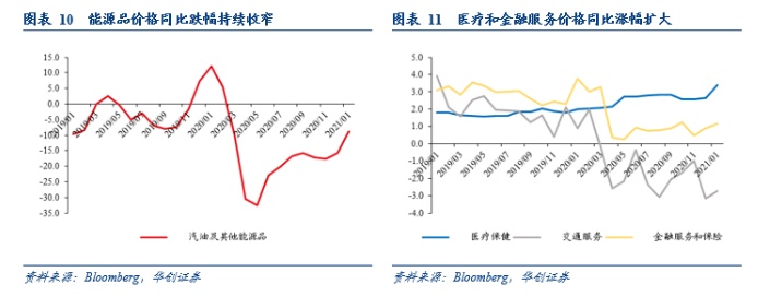 耐用品中,机动车及其零部件(4.0%)、家具及家用设备(2.4%)价格同比涨幅较上月分别回落0.3和0.5个百分点,主要受新机动车和家具价格上涨趋缓影响。电脑平板、运动器材等价格上涨,带动娱乐商品及交通工具(-0.5%)价格跌幅收窄0.6个百分点。珠宝手表价格涨幅扩大、医疗设备价格跌幅收窄,带动其他耐用品(-2.4%)跌幅收窄1.1个百分点。非耐用品中,食品饮料价格上涨3.6%,服装和鞋价格下跌3.5%,汽油和其他能源品价格下跌8.8%,较上月大幅收窄7.1个百分点。