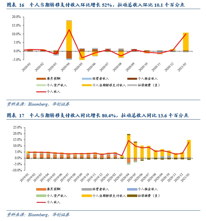 从环比拉动来看,雇员报酬增长0.7%,拉动总收入环比0.4个百分点;转移支付收入增长52%,拉动总收入环比10.1个百分点;个人租金收入增长1.1%,拉动个人总收入环比0.05个百分点。经营者收入和个人资产收入分别下降0.5%和3%,拖累总收入环比0.04和0.5个百分点。