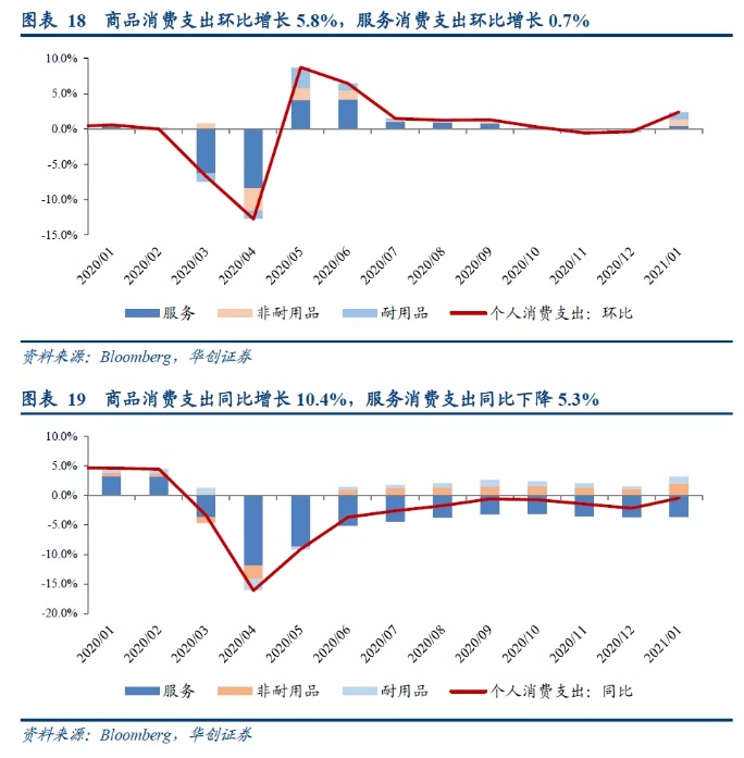 1月个人总收入环比大增10%,同比大增13.1%,主要原因是美国去年底通过的9000亿刺激法案落地实施,发放现金支票和失业救济金,政府社会福利增加使得转移支付收入环比大幅增长52%;在低基数效应下,同比也大增80.4%。1月个人消费环比增长2.4%,同比下降0.4%,可支配收入大幅增长带动个人消费支出增加,尤其体现在耐用品消费支出上。