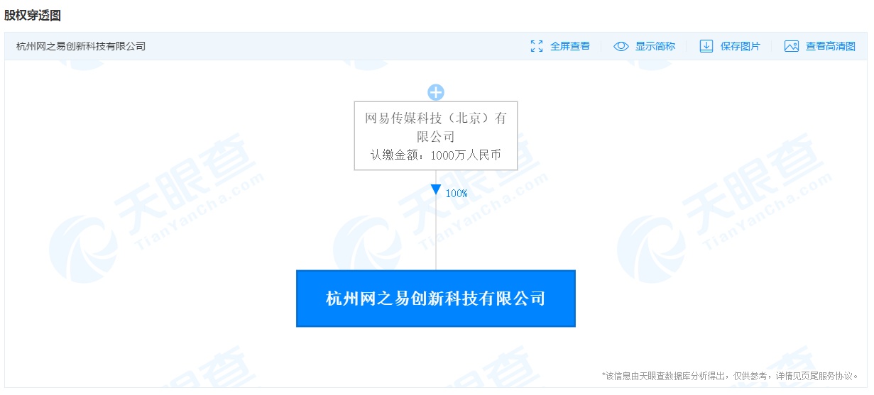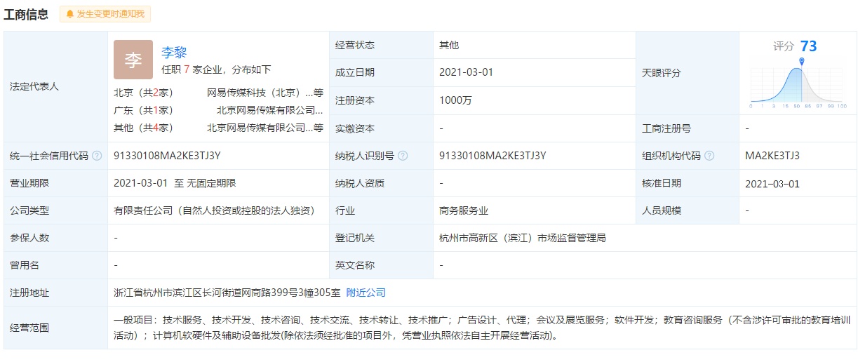 智通财经APP获悉,据天眼查App显示,3月1日,杭州网之易创新科技有限公司成立,注册资本1000万,法定代表人为李黎,公司经营范围含技术服务、技术开发;广告设计、代理;会议及展览服务;软件开发;教育咨询服务等。该公司由网易传媒科技(北京)有限公司100%持股。
