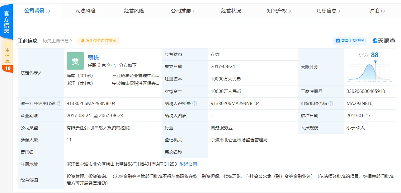 宁波梅山保税港区佰兴投资管理有限公司成立于2017年8月,注册资本1亿人民币,法定代表人为贾栋,经营范围主要包括投资管理、投资咨询等。
