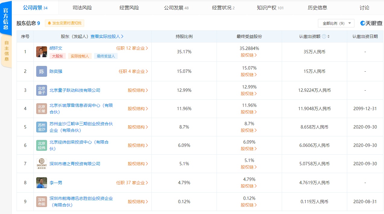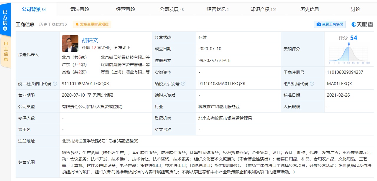 厚雪(北京)酒业有限公司成立于2020年7月,法定代表人为胡轩文,经营范围包括生产食品;基础软件服务;应用软件服务;计算机系统服务;经济贸易咨询;企业策划、设计;设计、制作、代理、发布广告;承办展览展示活动;会议服务等。天眼查App显示,北京量子跃动科技有限公司为该公司第三大股东,持股比例为12.99%。