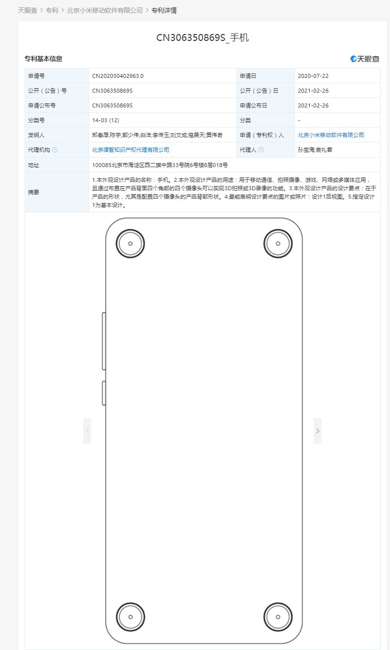 该专利摘要显示,本外观设计产品用于移动通信、拍照摄像、游戏、网络或多媒体应用,且通过布置在产品背面四个角部的四个摄像头可以实现3D拍照或3D录像的功能。本外观设计产品的设计要点在于产品的形状,尤其是配置四个摄像头的产品背部形状。