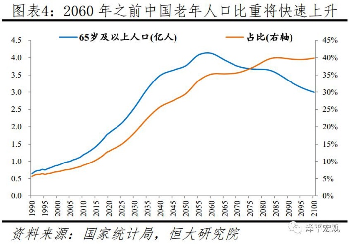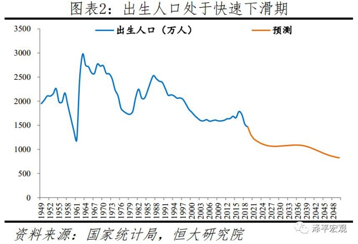 据恒大研究院任泽平在《中国人口报告2020》中提到,2019年中国出生人口降至1465万,65岁及以上人口占比达12.6%,人口总量在“十四五”时期将不可避免进入负增长。按照当前趋势,随着全面二孩政策效应彻底消失、受教育水平提高、城市化推进等,未来总和生育率将从2019年的1.5下滑至1.0-1.2左右。