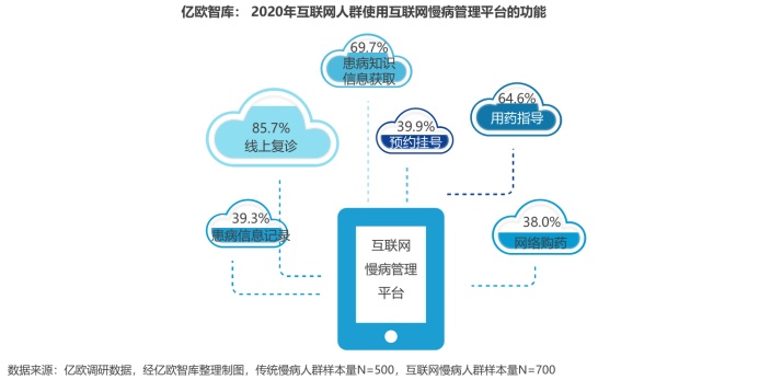 以慢病领域为例,高血压、脑卒中、冠心病、糖尿病、慢阻肺、癌症等慢性疾病已经成为我国居民的主要健康问题,由慢性病导致的疾病负担占总疾病负担近7成。其中,据亿欧调研数据显示,在当前互联网慢病人群,约有61.7%通过医生推荐认知互联网慢病管理平台,约有85.7%使用线上复诊功能。