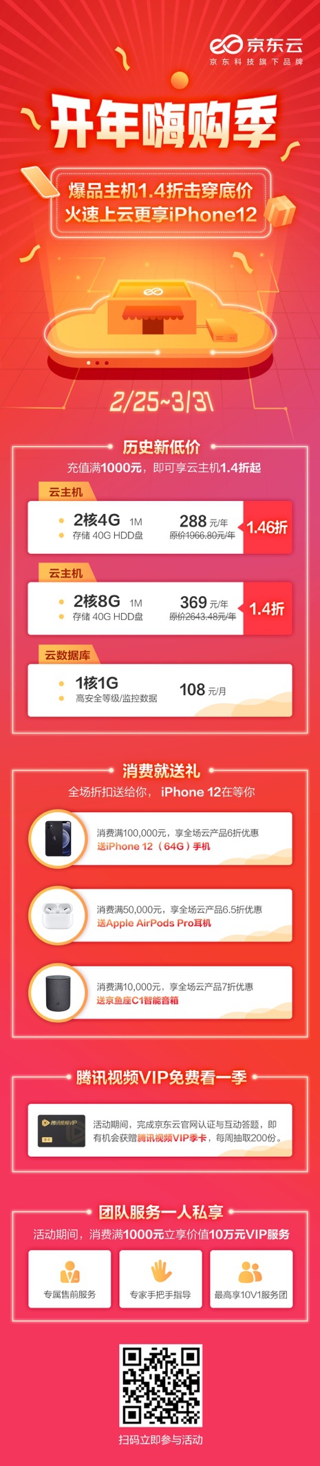 日前,京东云推出的一场活动为中小企业上云带来了利好!——为助力中小企业与开发者2021年强势开局,京东云在2月25日至3月31日推出了“开年嗨购季”促销活动,活动京东云新老用户均可享受同等优惠,云主机、云数据库、云存储、云硬盘、云安全等多类爆款产品低至1.4折起。活动期间,开发者或企业用户完成京东云官网认证与互动答题,还将有机会获赠腾讯视频VIP季卡。消费万元起就有京鱼座C1智能音箱、京鱼座I8智能音箱、iPhone 12 64G手机等豪礼相送。值得关注的是,京东云的售前服务在本次活动中也全面开放,消费满1000元立享价值10万元的VIP服务——专属售前服务、技术专家支持、最高10V1服务团提供管家式贴心服务,免费备案让用户少花冤枉钱,100倍故障时长赔偿保障用户安心无忧。