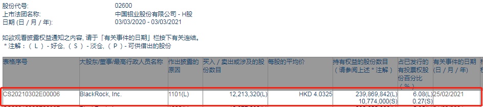 智通财经APP获悉,香港联交所最新资料显示,2月25日,贝莱德增持中国铝业(02600)1221.332万股,每股作价4.0325港元,总金额约为4925.02万港元。增持后最新持股数目为2.399亿股,最新持股比例为6.08%。