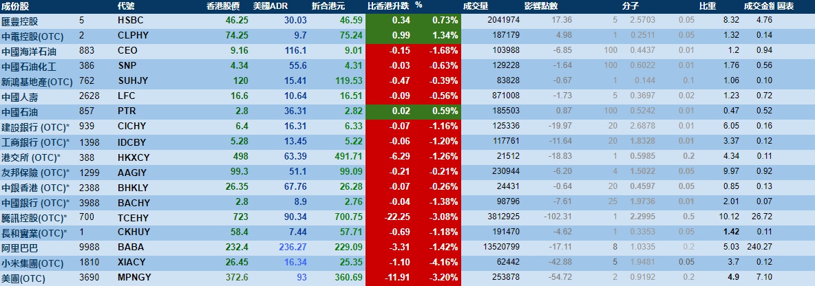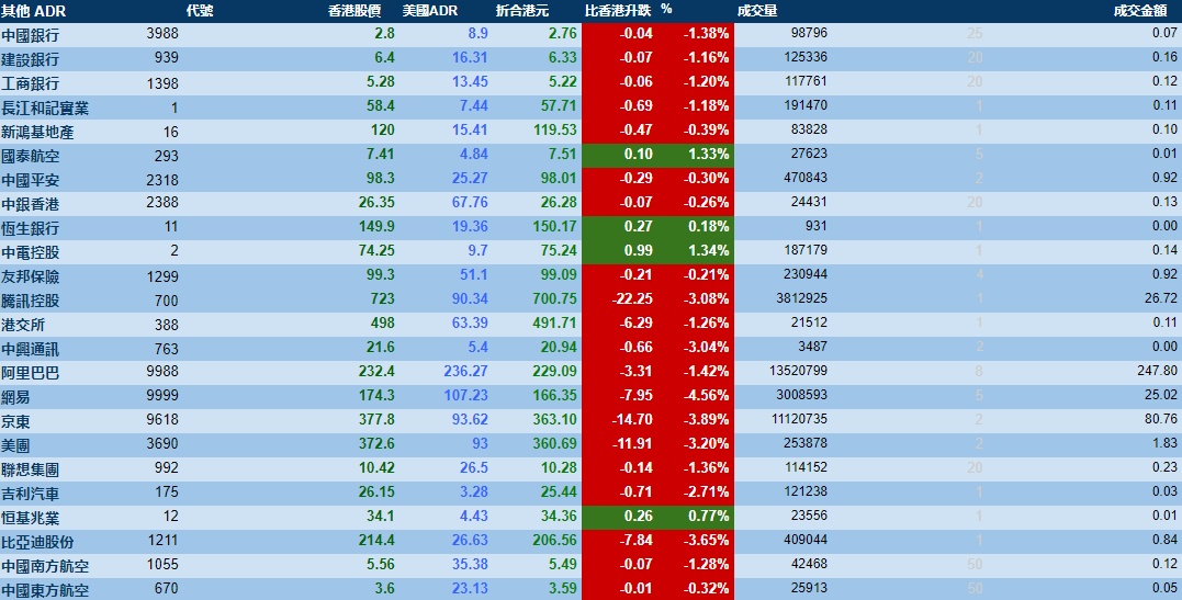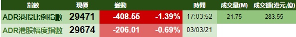 智通财经APP获悉,周三美股三大指数齐跌,港股ADR指数下挫,按比例计算,收报29471点,跌408.55点或1.39%。