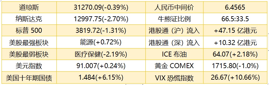 1、 隔夜美股收盘,道琼斯指数跌121.43点,跌幅0.39%,报31270.09点;标普500指数跌50.57点,跌幅1.31%,报3819.72点;纳斯达克综合指数跌361.04点,跌幅2.70%,报12997.75点。港股ADR指数下挫,按比例计算,收报29471点,跌408.55点或1.39%。