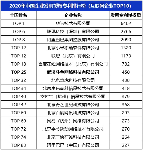 其中,国内领先的游戏直播平台斗鱼(DOYU.US),发明授权专利申请量位居中国互联网行业第七,是直播行业唯一上榜平台,再次彰显出其强大的技术研发实力。