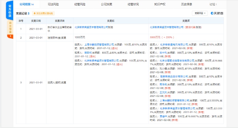 据天眼查APP,共青城新鼎华麒贰号股权投资合伙企业(有限合伙)近日发生工商变更,原投资人上海华麒投资管理有限公司、新鼎资本、苗田欣退出,新增周黑鸭食品股份有限公司、北京移数通电讯有限公司、黄德平、周洛宏等为投资人,同时该企业注册资本由1000万元变更为3000万元,增幅为200%。