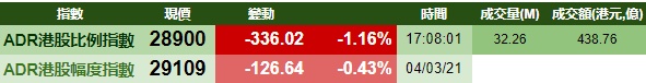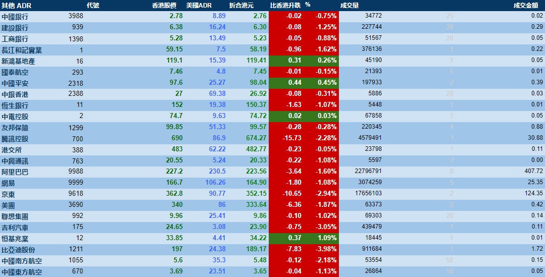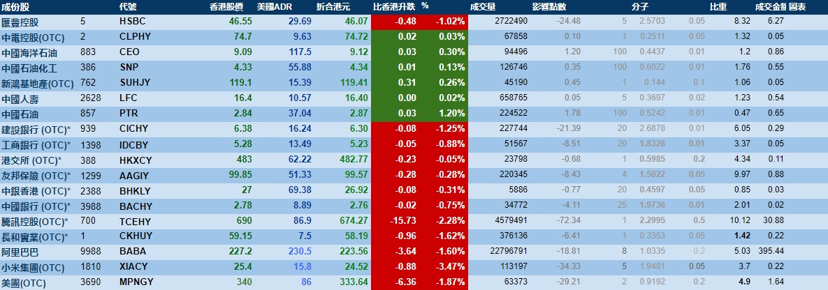 智通财经APP获悉,周四美股三大指数齐跌,港股ADR指数下挫,按比例计算,收报28900点,跌336.02点或1.16%。