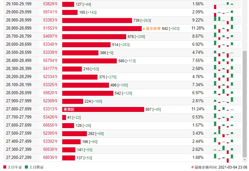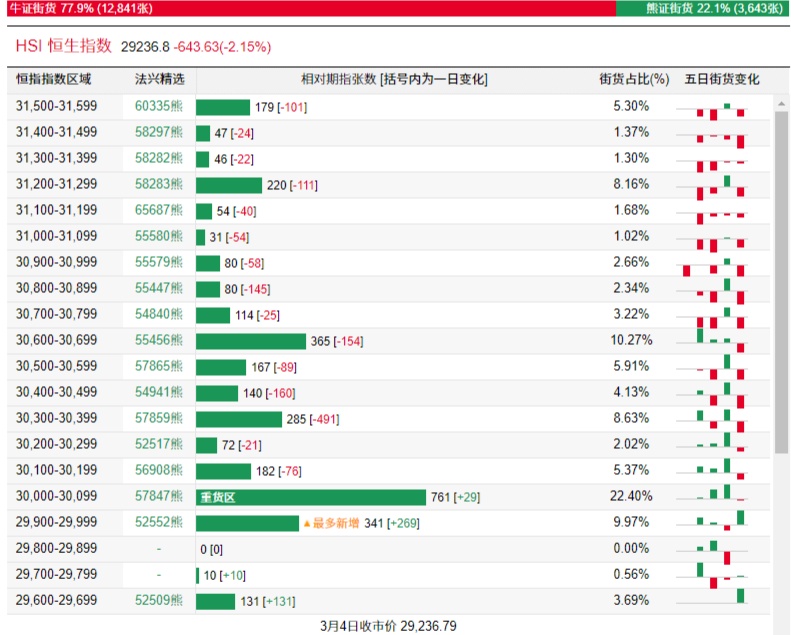 法兴恒指牛熊证街货分布图中的数据显示,熊证街货重货区在30000-30099区间,该区间最新熊证数量为761张,较上一交易日增加29张,最多新增在29900-29999区间,熊证数量为341张,增加269张。牛证街货重货区在27800-27899区间,该区间最新牛证数量为867张,较上一交易日增加45张。最多新增在28800-28899区间,该区间最新牛证数量为842张,较上一交易日增加503张。