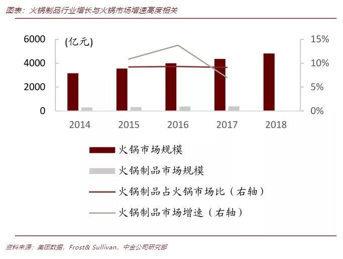 B端火锅餐饮行业快速增长带动速冻火锅制品行业规模快速增长,速冻火锅料市场整体保持较高增速。速冻火锅料市场规模2017年为398亿元,2014-2017年3年CAGR为10.5%。由于火锅餐饮对丸类火锅料等追求高性价比、对食材新鲜度要求低,因此速冻火锅制品仍是火锅餐饮业原材料首选,未来或将随火锅餐饮行业实现快速增长。