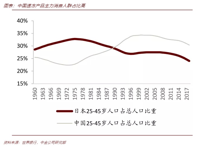 同时日本的主力消费人群规模在2000年前也处于高位。若将25-45岁上班族定义为速冻食品的主力消费人群,则日本速冻食品的消费主力人群规模占比在2000年前先升后降,整体保持高位。