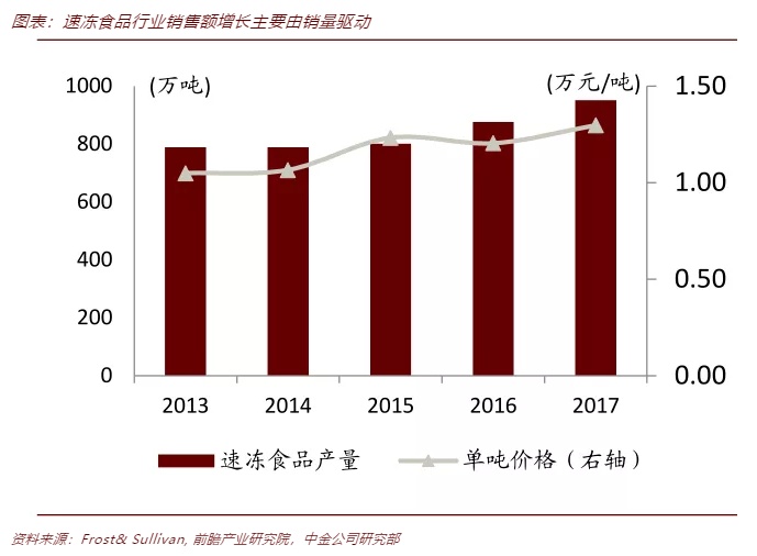 我们认为目前行业发展短期看仍由需求侧推动,需求大于供给将持续性带动行业发展,产能扩张仍是主线。而行业增速趋于平稳与产品同质化程度高将制约速冻食品企业抬高价格,市场将维持量增为主趋势。
