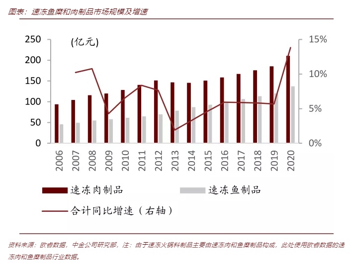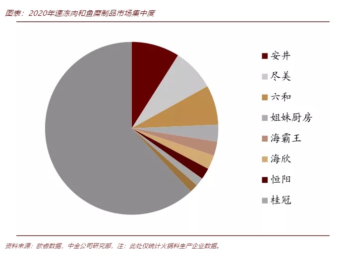 细分行业速冻火锅料市场保持较高增速,且市场集中度具备提升空间。速冻火锅料市场规模2017年为398亿元,占速冻市场整体的32%,2014-2017年3年CAGR为10.5%。根据欧睿数据,行业CR3从2015年的17.25%提升到24.31%,安井超越尽美成为市场第一,2020年市场占有率达到9%。