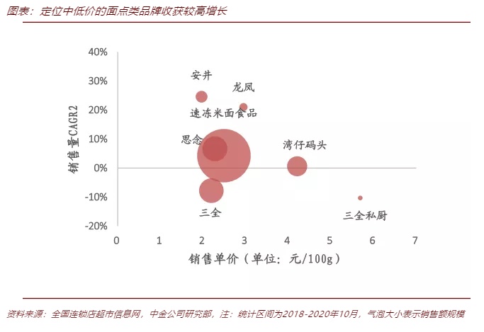 速冻米面市场中的面点和休闲细分品类增速较高,值得持续关注。安井、广州酒家和潮香村等玩家小角度切入也抢占了一定市场份额。近两年,价格水平定位中低水平、主打发面制品的安井和兼有包子类目的龙凤都实现高于行业的增速,其中安井凭借手抓饼等成功大单品已经进入面点和休闲品类的市占率前三。