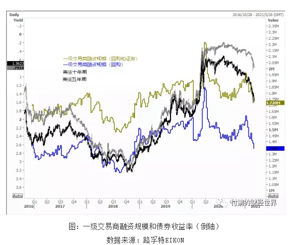 不断在收缩的一级交易商的融资规模身体力行的带来着债券收益率的走高,FED不仅仅是预期管理在改变远端债券市场的预期,同时也身体力行的引导着收益率的上行;
