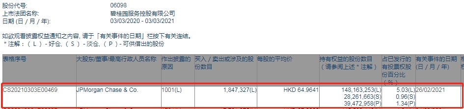 智通财经APP获悉,香港联交所最新资料显示,2月26日,摩根大通增持碧桂园服务(06098)184.7327万股,每股作价64.9641港元,总金额约为1.2亿港元。增持后最新持股数目为1.48亿股,最新持股比例为5.03%。
