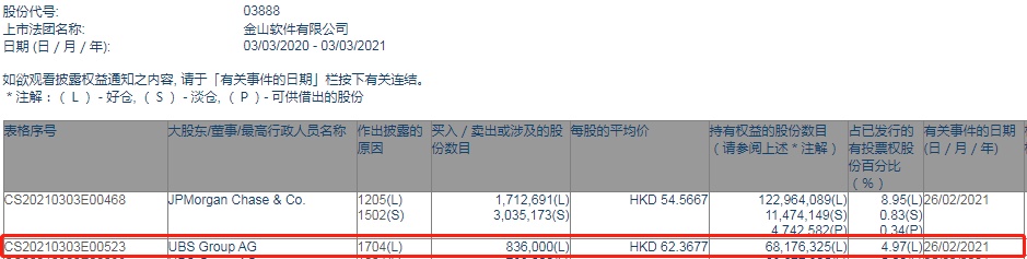 智通财经APP获悉,香港联交所最新资料显示,2月26日,瑞银减持金山软件(03888)83.6万股,每股作价62.3677港元,总金额约为5213.94万港元。减持后最新持股数目为6817.6325万股,最新持股比例为4.97%。