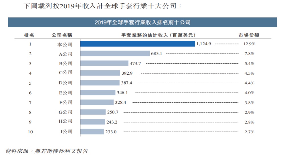 根据弗若斯特沙利文数据,2019年按销售收入、销量及产能计,公司在全球市场份额分别为12.9%、10.0%及10.6%。而按产能计,2020年的全球市场份额为11.8%,按此产能计,约为全球手套行业第二大制造商的两倍。