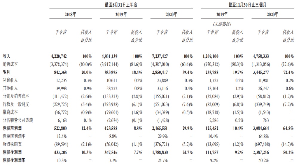 于截至2020年11月30日止三个月,公司收入及毛利分别为47.58亿令吉及34.45亿令吉,较上年同期分别增加293.5%及1342.8%。毛利率由截至2019年11月30日止三个月的19.7%增加至截至2020年11月30日止三个月的72.4%。招股书指出,期内强劲业绩要归因于公共卫生事件期间手套产品前所未有的需求。