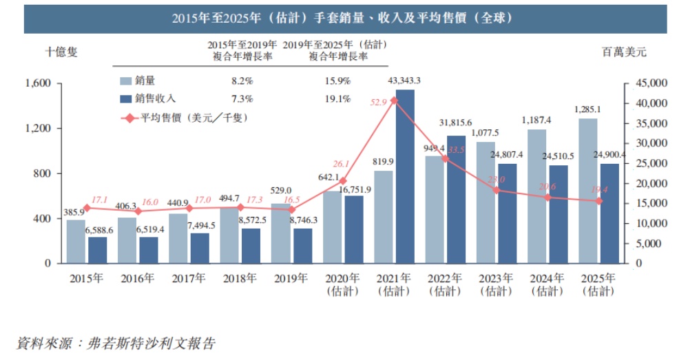 智通财经APP注意到,在2020年以前,全球手套处于温和增长态势。销量和销售额分别由2015年的3859亿只及65.89亿美元增至2019年的5290亿只及87.46亿美元,复合年增长率为8.2%及7.3%。预计手套行业的销量及收入将于2025年达到12851亿只及249亿美元,2019年至2025年的复合年增长率分别为15.9%及19.1%。