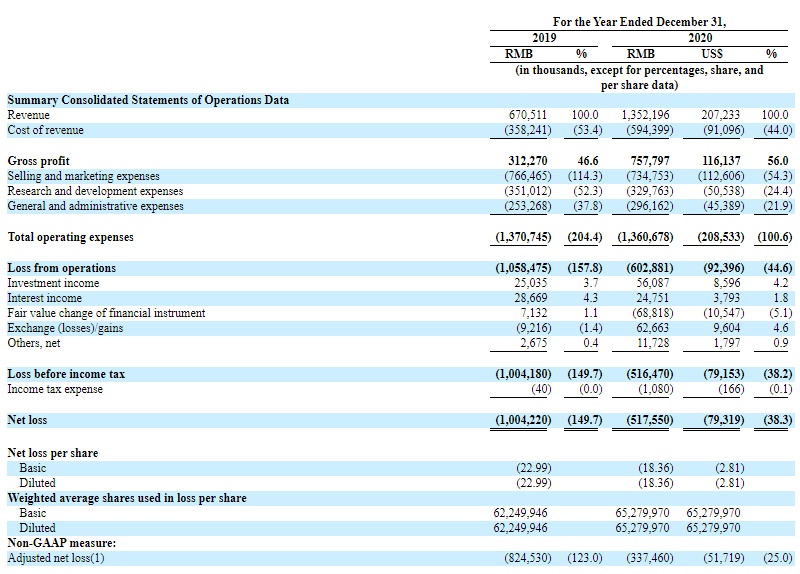 招股书显示,2020年总营收13.52亿元,2019年营收6.71亿元,同比增长 101.7%。2020年毛利7.58亿元,2019年毛利3.12亿元,同比增长142.7%。2020年毛利率56%,2019年毛利率46.6%,同比增长20.2%。2020 年净亏损 5.18 亿元,2019年净亏损10亿元,同比收窄48.2%。