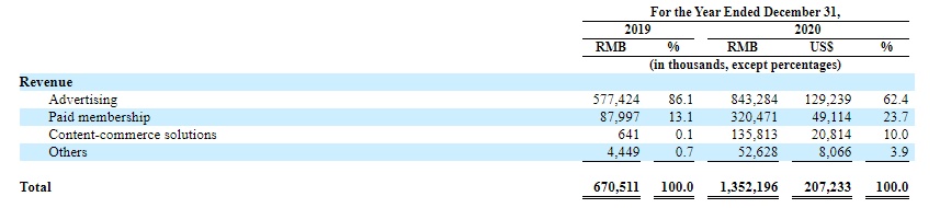 其中,2020年的广告收入8.43亿元,较之前一年增长46%;对总营收占比降至62.4%(前一年为86.1%)。付费会员收入3.2亿元,同比大增264%,对总营收贡献升至23.7%(前一年为13.1%)。