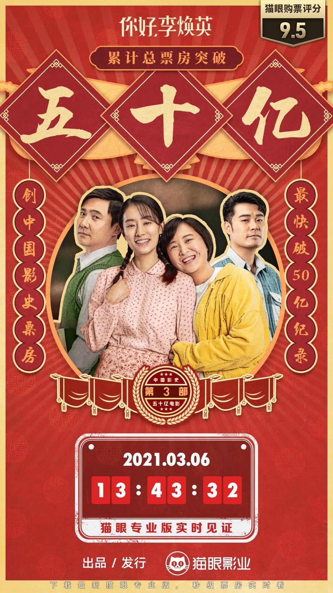 3月6日,《你好,李焕英》总票房正式突破50亿大关,跃居中国票房影史第二名,打破了中国影史最快破50亿票房的纪录。对于出品及主控发行方猫眼娱乐(01896)来说,比起这一成绩本身,更重要的是猫眼长期以来的“三环联动、全链路发行”的方法论再一次得到了验证。