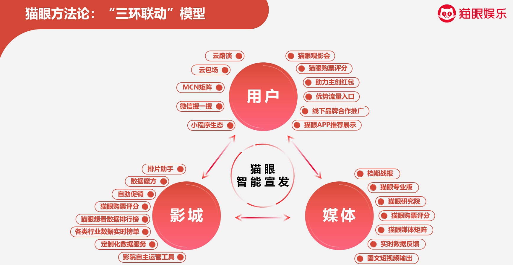 在影片发行过程中,猫眼的“三环联动、全链路发行”方法论发挥了重要优势。所谓“三环联动”,猫眼通过将用户、院线和媒体有效打通并紧密联系在一起,在用各种创新产品触达用户的同时,又将数据同步分享给院线,让院线切实感受到影片的卖点,和用户的观影热情,从而给到足够的场次和排片。与此同时,媒体借助猫眼及时分享同步的数据,获得关于影片准确、专业的各类分析,并通过传播强化观众认知和口碑,提升观众观影热情。