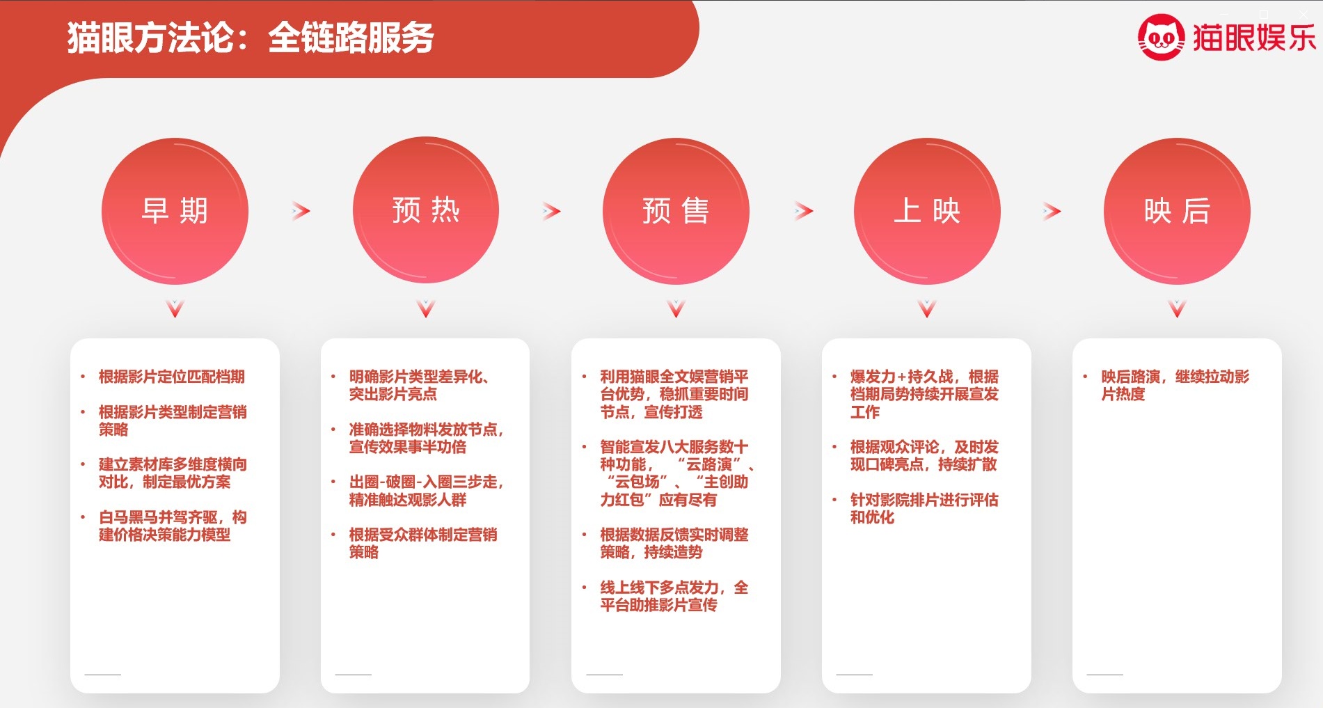 “三环联动”的成功逻辑建立在全链路宣发服务之上,即通过早期、预热、预售、上映和映后五大环节的组合运用,集全平台之力,精准触达每个环节,帮助电影实现发行突破。而这样的服务与方法论,不仅仅是适用某一部影片,而是猫眼在服务过众多影片中总结和沉淀的宝贵经验。