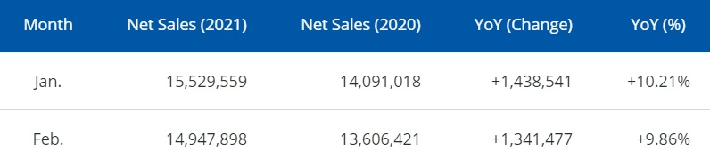 智通财经APP获悉,3月8日,联电(UMC.US)公布了2021年2月月度销售额,数据显示,联电2月营收为149.48亿新台币,2020年同期为136.06亿新台币,同比增长9.86%。1-2月的总营收为304.77亿新台币,同比增长10.04%。